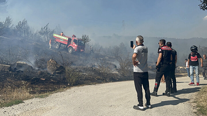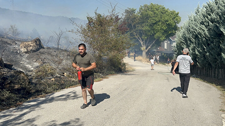 Yerleşim alanlarına yakın olan yangını söndürmek için ekiplerin çalışması sürerken, vatandaşlar da bahçe hortumları ve kendi imkanlarıyla ekiplere destek veriyor.