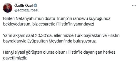 Özgür Özel’den Filistin mitingi çağrısı… “Birileri Trump’ın randevu kuyruğunda”